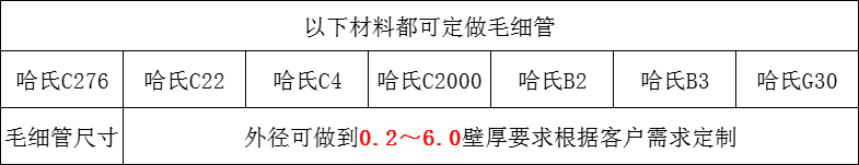 哈氏合金毛细管是一种镍基耐腐蚀合金,主要分成镍-铬合金与镍铬钼合金两大类。哈氏合金具有良好的抗腐蚀性和热稳定性,较高的钼、铬含量使合金能够耐氯离子腐蚀,钨元素进一步提高了耐蚀性。同时C-276是仅有的几种耐潮湿氯气、次氯酸盐及二氧化氯溶液腐蚀的材料之一,对高浓度的氯化盐溶液如氯化铁和氯化铜有显著的耐蚀性。适用于各种含有氧化和还原性介质的化学工业,热交换器、波纹管补偿器、化工设备、烟气脱硫脱硝、造纸工业、航天应用、酸性环境。