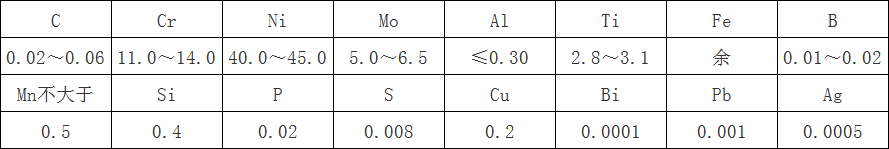 是以Fe-43Ni-12Cr为基,加入钛、铝及相等强化元素的奥氏体型时效硬化合金,并含有微量的硼和较低的碳,经亚稳的γ"[Ni3(Ti、Al)]相弥散强化,微量的铝可抑制γ"向η-Ni3Ti相的转化。合金在650℃以下具有较高的屈服强度和持久强度,760℃以下抗氧化性良好,长期使用组织稳定。该合金是早期发展的较成熟的合金,广泛用于制造在650℃以下工作的航空及地面燃气涡轮发动机的转动盘形件(涡轮盘、压气机盘、轴颈等)、静结构件、涡轮外环及紧固件等零部件。